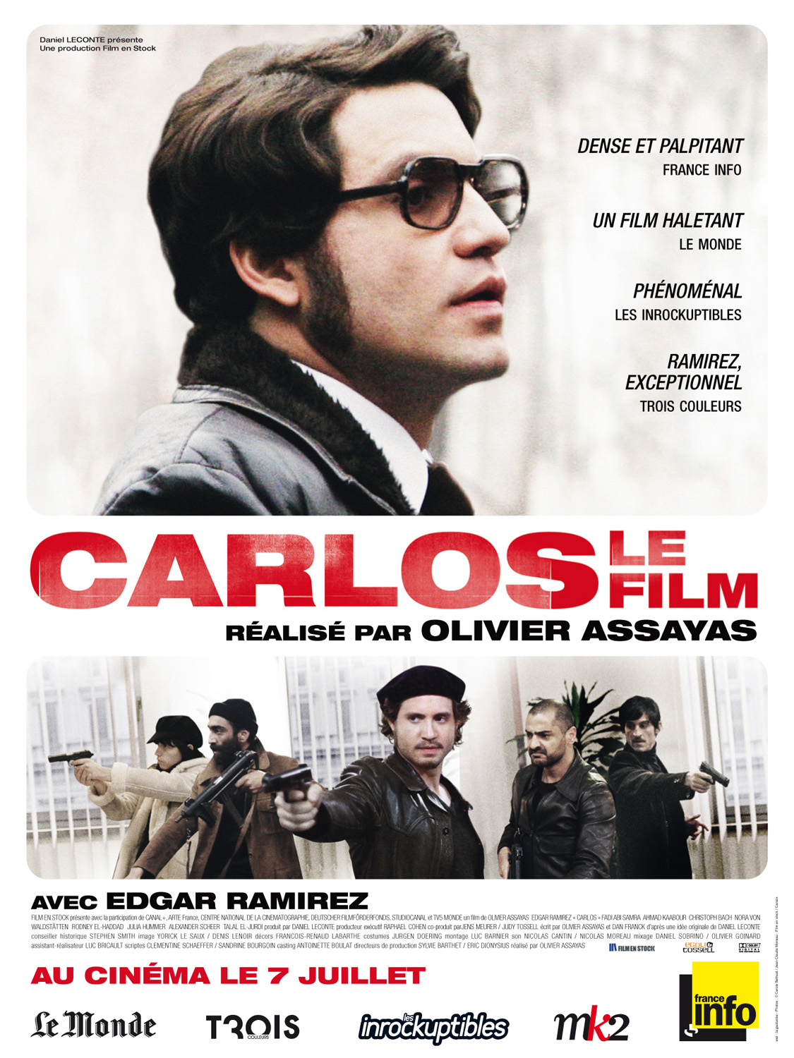 Tourné pour la chaîne Canal Plus en trois épisodes pour une durée totale de plus de 5 heures, le film est sorti en salles dans un montage de 2 h 30. Je n’ai pas vu la version télé, c’est donc de l’autre dont je vous parle. Olivier Assayas a réussi un pari fou avec ce film sur un personnage mythique, symbole du terrorisme international de la fin du XXème siècle. La difficulté tenait en particulier au fait que le tournage se situait dans une dizaine de pays et d’innombrables décors et mettait en jeu plus de cent vingt comédiens dans plus de sept langues. Dans un souci de véracité, Assayas a laissé d’ailleurs chaque personnage s’exprimer dans sa propre langue. Très documenté, le film offre un cours magistral de géopolitique tout en se posant comme un objet cinématographique passionnant. Outre une mise en scène magistrale et un scénario palpitant, Assayas a fait bonne pioche en confiant le rôle du révolutionnaire à Edgar Ramirez, monstre physique au charisme dévastateur, d’ailleurs couronné par un Cesar du meilleur espoir masculin en 2011. Le cinéaste français se montre digne avec « Carlos » des plus grands réalisateurs américains du genre. Vive la France!